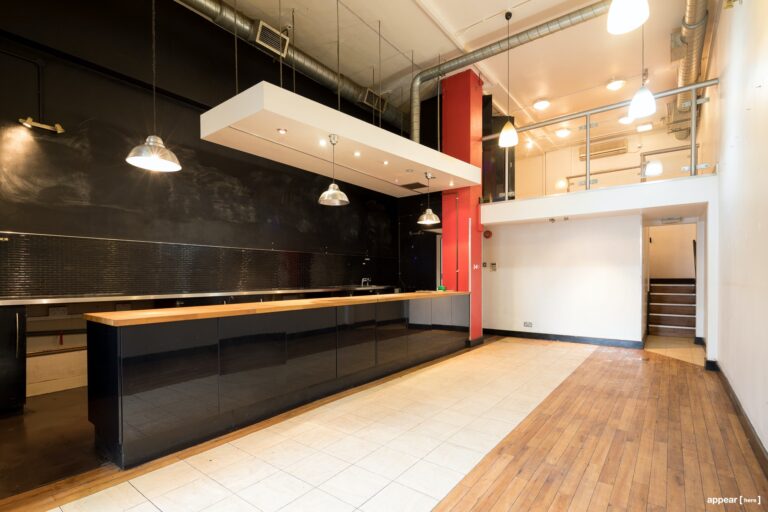 One of the capital’s most fashionable addresses in the late 1600s, this gem of a garden square is still home to a few notable residents – including the British Board of Film Classification, 20th Century Fox and Tiger Aspect – and is a haven for lunching office workers, especially on warmer days. On the Oxford Street side of the square, this industrial-style space to rent comes with a small mezzanine level, and while it’s fitted out for F&B, it wouldn’t take much to revamp for retail.